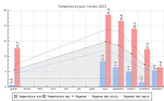 | Mois | Températures min | Températures max | Moyenne mensuelle |